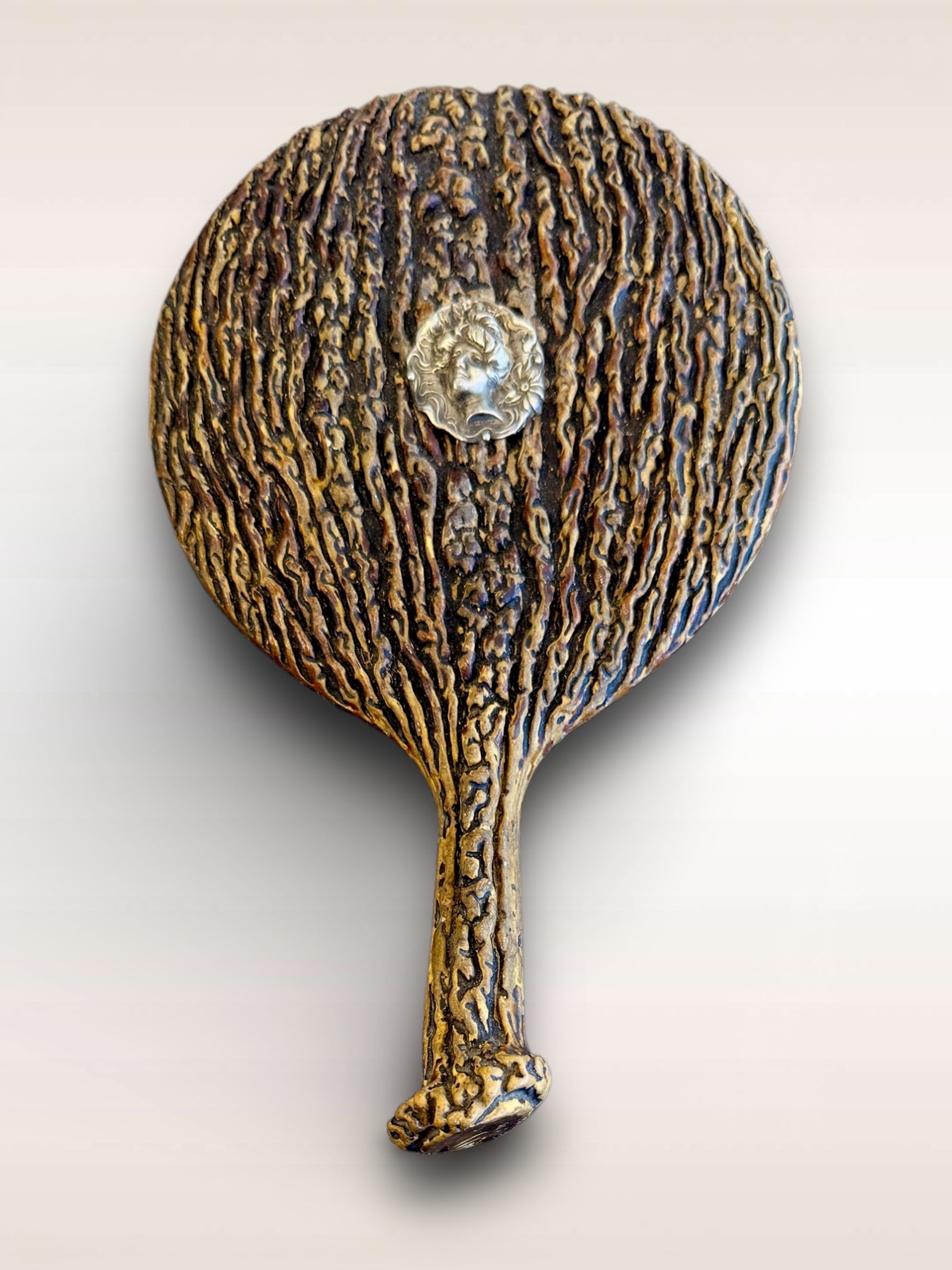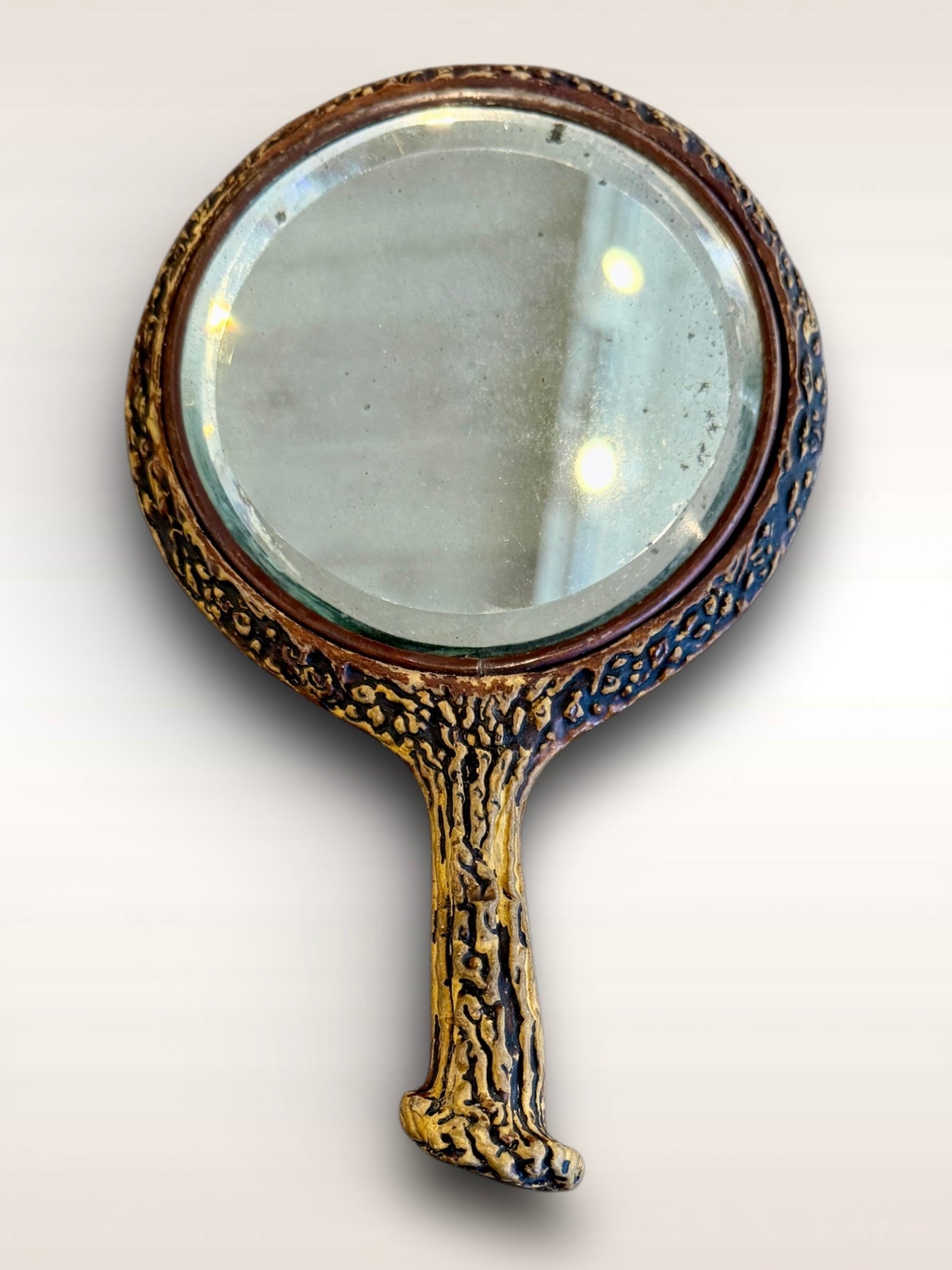 Antique paper-mache/plaster faux bois mirror with beveled glass & silver dame.