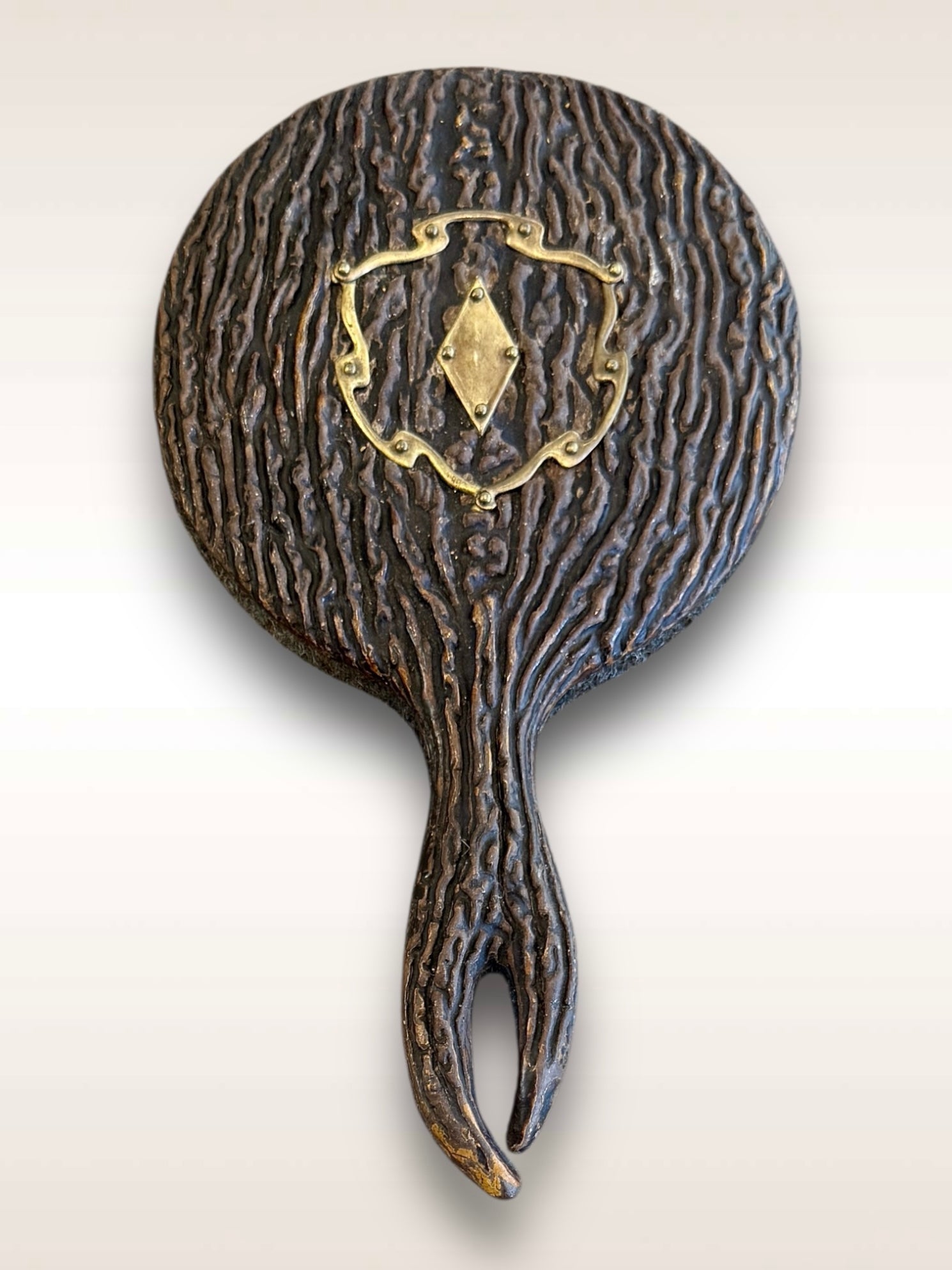 Antique paper-mache/plaster faux bois mirror with beveled glass & brass diamond.